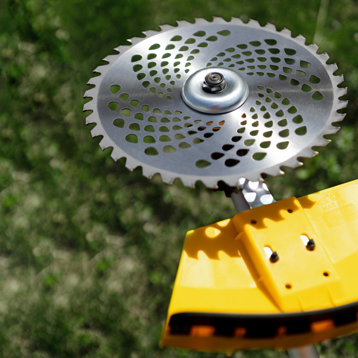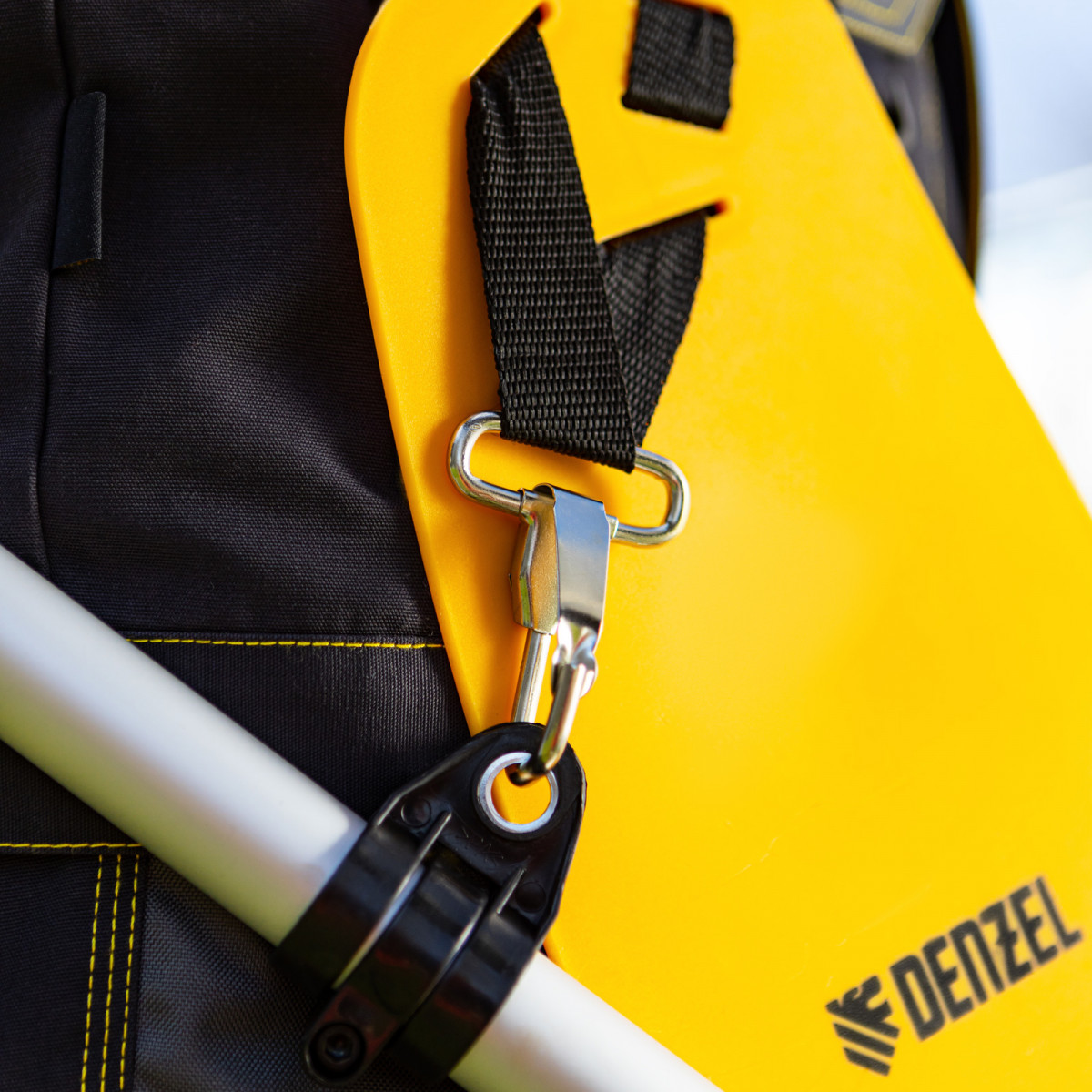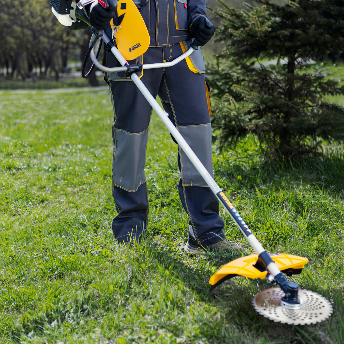 • Дополнительные возможности — можно приобрести и установить на триммер диск Denzel 96323 для быстрого удаления растительности с жесткими стеблями, 96328 для скашивания молодых побегов кустарника диаметром до 3 мм