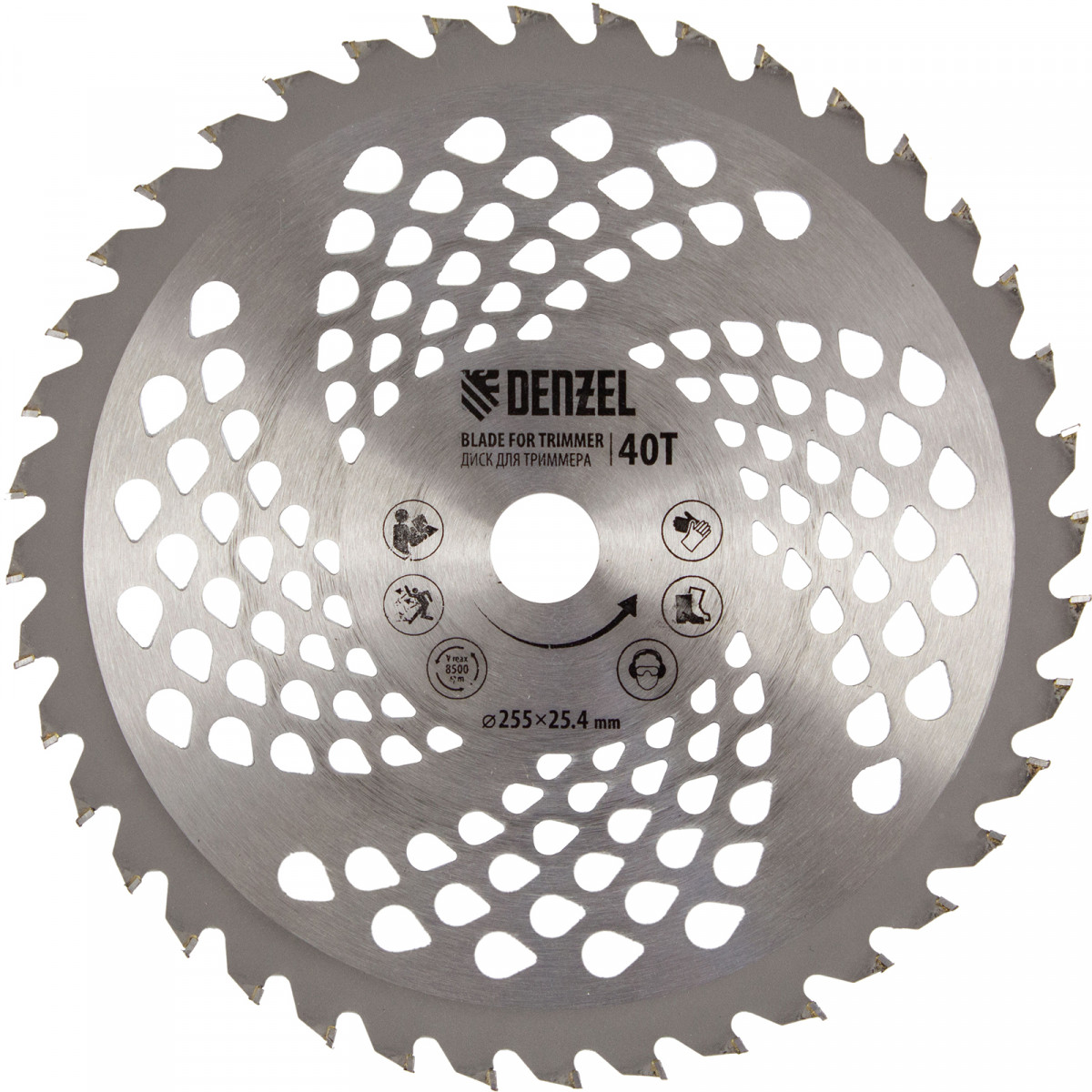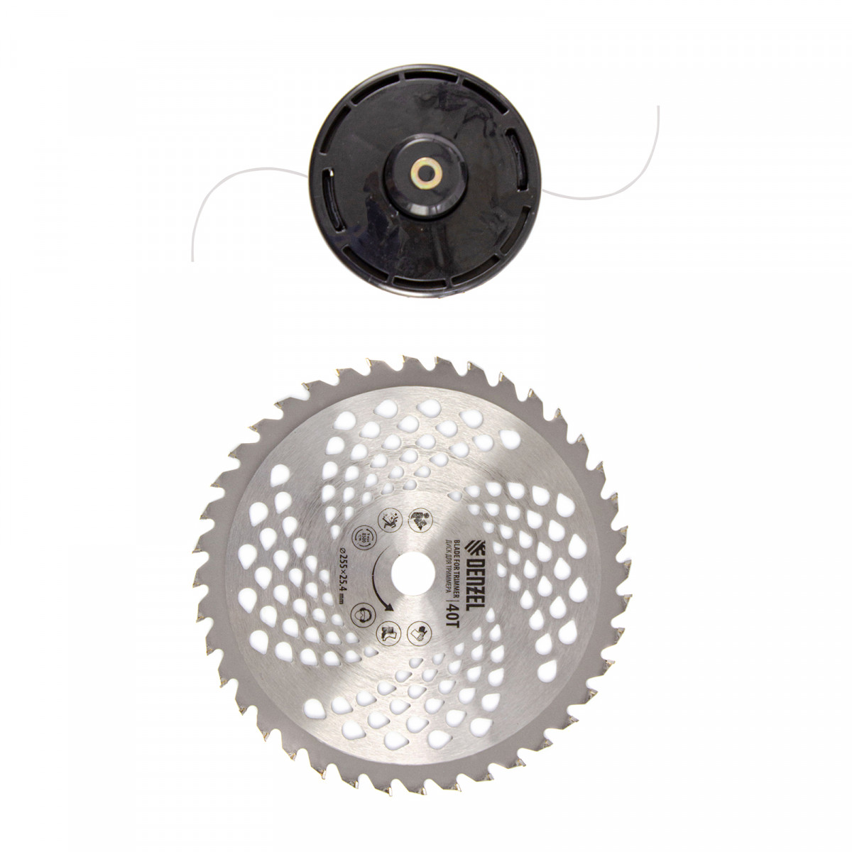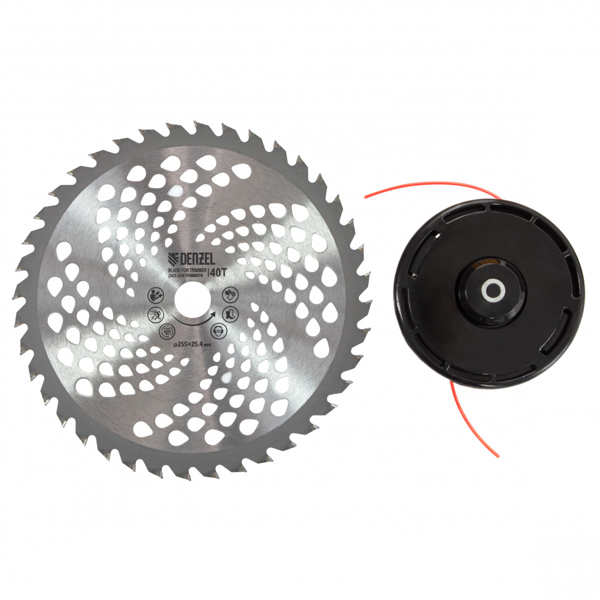 - Дополнительные возможности — можно приобрести и установить на триммер диски Denzel 96323, 96325 для быстрого удаления растительности с жесткими стеблями, 96328 для скашивания молодых побегов кустарника диаметром до 3 мм.