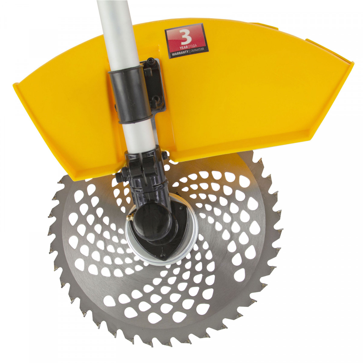 - Безопасность — пластиковый кожух защищает пользователя от вылетающей травы, камней, веток и мелких частиц.