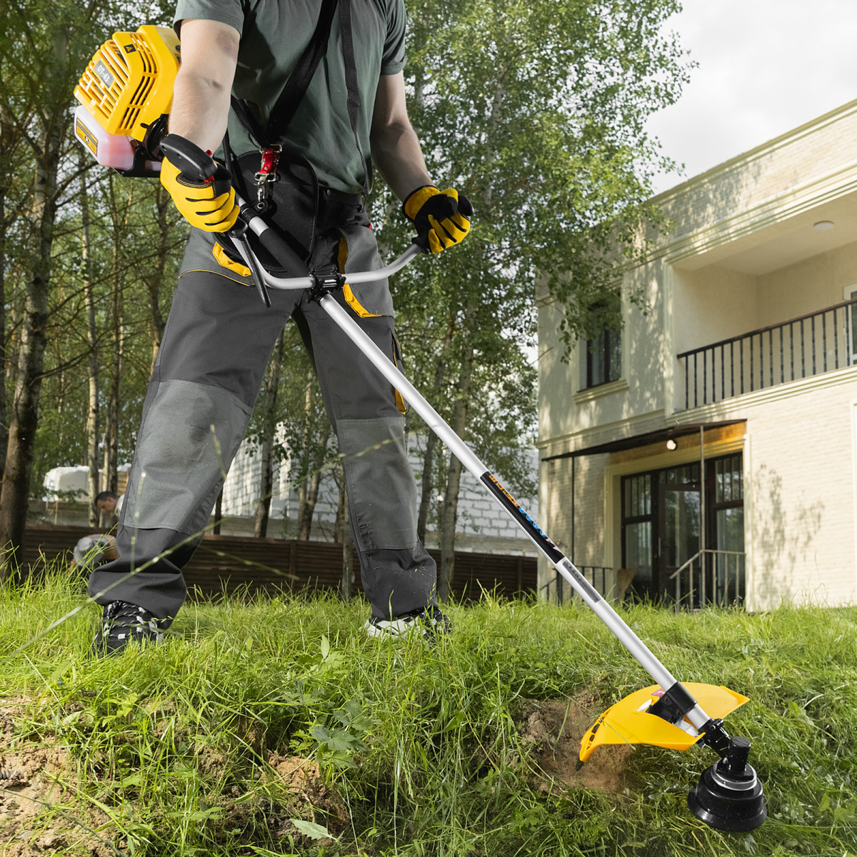 - Уменьшенная нагрузка на плечи и спину — триммер весит 7,5 кг и комплектуется наплечным ремнем.