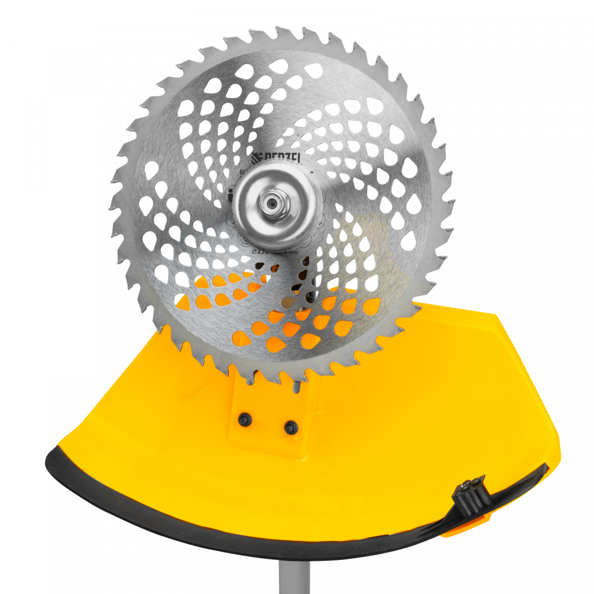 - Дополнительные возможности — можно приобрести и установить на триммер диски Denzel 96323, 96325 для быстрого удаления растительности с жесткими стеблями (полыни, крапивы, лебеды), 96328 для скашивания молодых побегов кустарника диаметром до 3 мм.