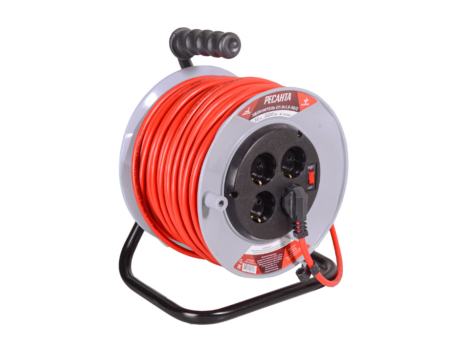 Удлинитель силовой на металлической катушке СУ-3х1,5-50/2 с выключателем 4 розетки РЕСАНТА