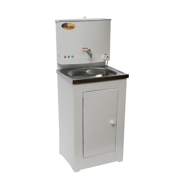 Модель состоит из тумбы и бака емкостью 17 л, в котором установлен ТЭН мощностью 1300 Вт. На бачке имеется кран, с помощью которого можно плавно регулировать напор воды. Наличие терморегулятора позволяет выбрать оптимальную температуру нагрева. На тумбе установлена раковина из нержавеющей стали со сливом. Сливную трубу можно вывести в канализацию или специальную емкость, которая устанавливается внутри тумбы и легко вынимается через большую дверцу.