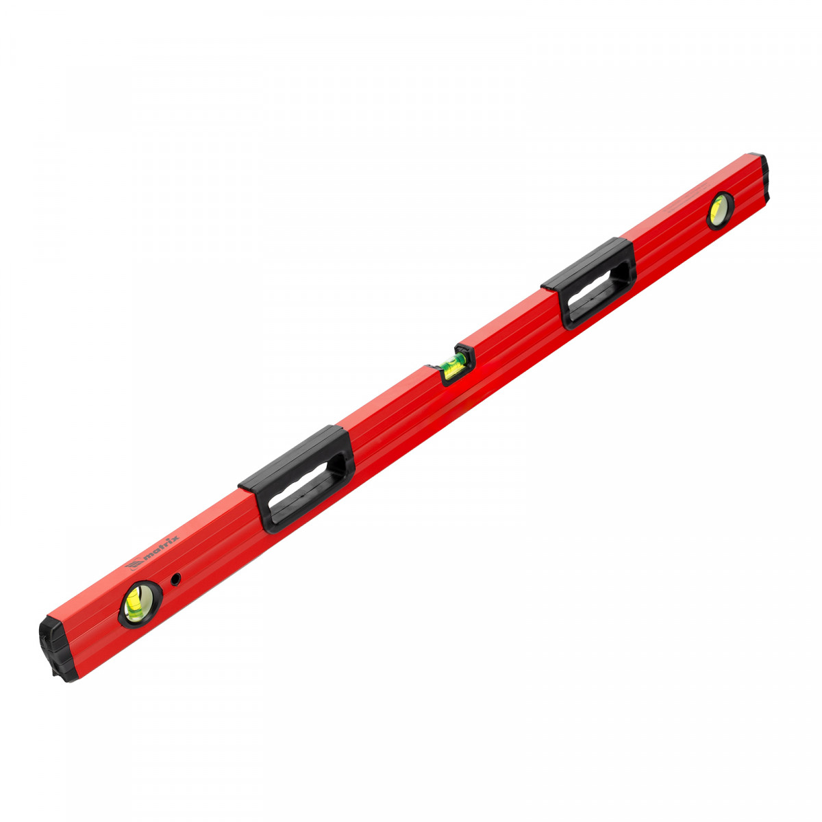 Фрезерованный алюминиевый уровень Matrix 33228 длиной 1000 мм, с 3 глазками и 2 эргономичными ручками, поможет проверить горизонтальные и вертикальные поверхности, выставить угол 45 градусов. Он будет полезен на любом этапе строительства и ремонта: при облицовке и отделке поверхностей, монтаже конструкций и т.д. Погрешность измерений на метр не превышает 1 мм (0,057 градуса).,Для определения отклонения вертикали 90 градусов необходимо использовать пузырьковую ампулу только в верхнем положении уровня. Только базовая поверхность является рабочей (противоположная ампуле 180 градусов).