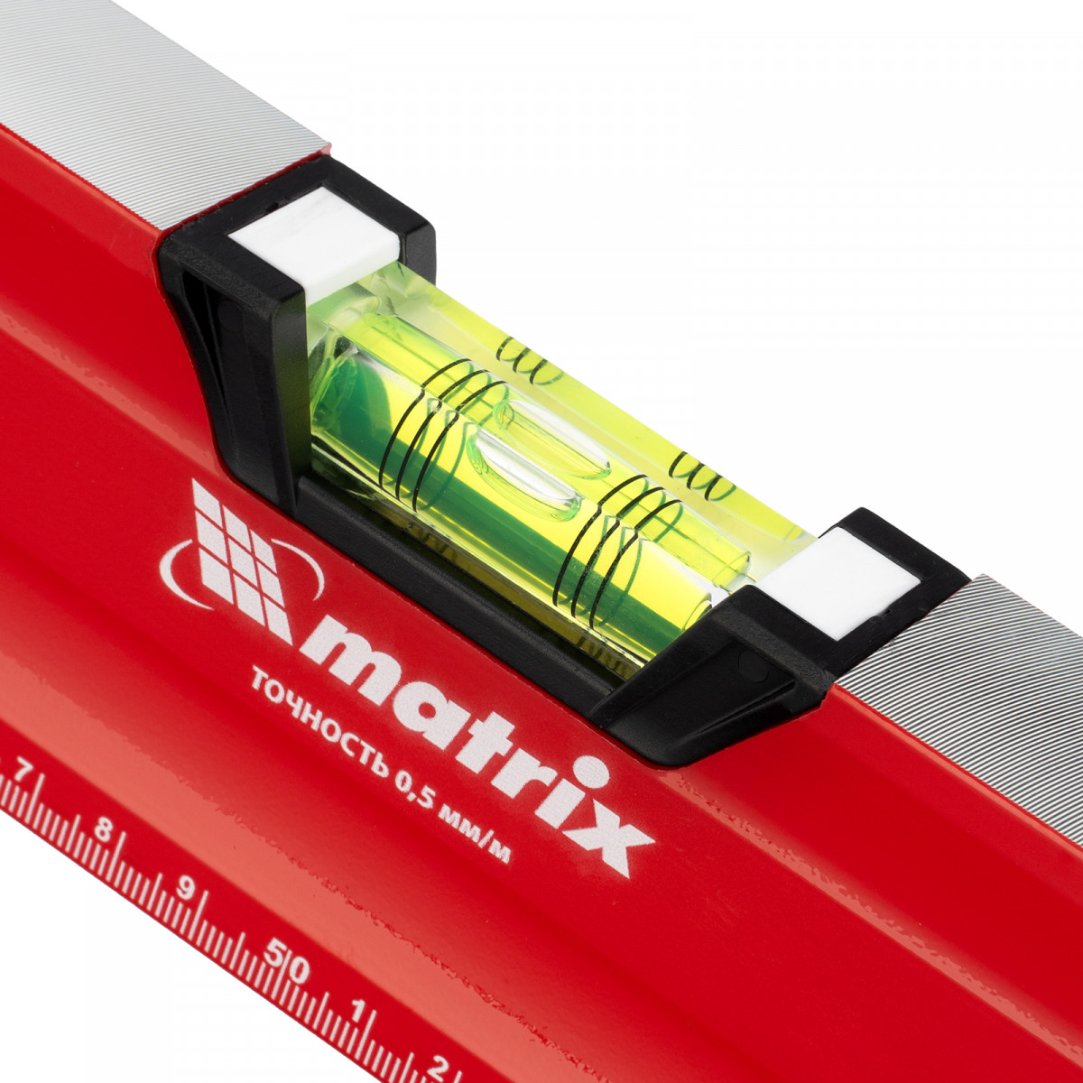 Уровень алюминиевый фрезерованный Matrix 34733 длиной 1000 мм, с магнитной полосой и 2-компонентными рукоятками, 3 глазками и 1 зеркальным отражателем, — измерительный инструмент для контроля отклонений поверхностей от горизонтали, вертикали и угла 45°. Используется для выполнения работ, требующих высокой точности.