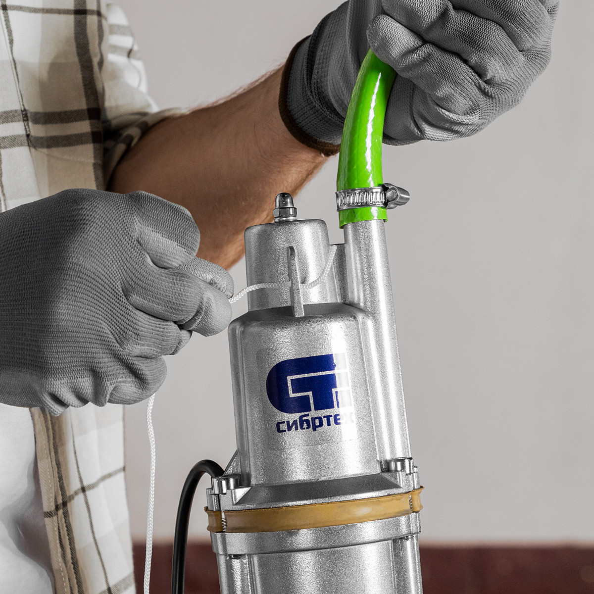 • Необходимые аксессуары в комплекте — трос для погружения и хомут для закрепления шланга прилагаются к насосу.