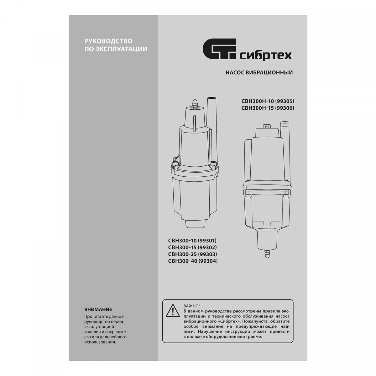Вибрационный насос СВН300Н-10, нижний забор, 300 Вт, напор 75 м, 1200 л/ч, кабель 10 м Сибртех