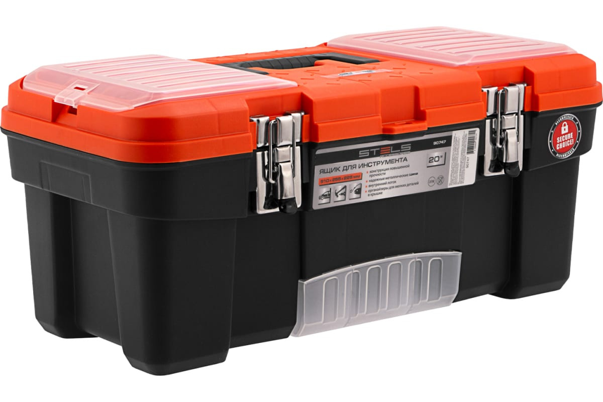 Ящик для инструмента с металлическими замками STELS 20", 510x255x225 мм 90747 — альтернатива коробке для инструментов. В нем можно расположить ручной инструмент, крепежи, хозяйственные мелочи, а также рыболовные снасти.