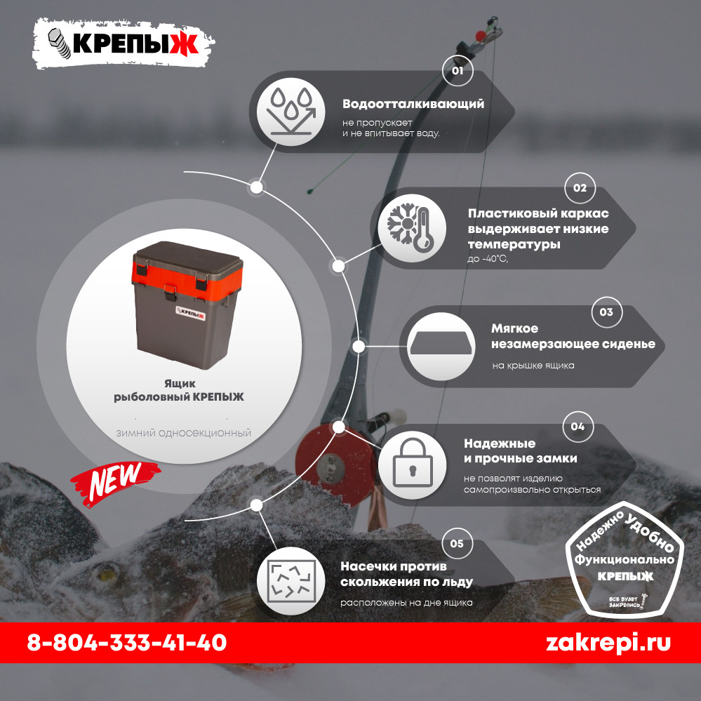 Ящик рыболовный зимний односекционный торговой марки Helios, изготовленный из ударопрочного, морозостойкого и в то же время легкого пластика, обеспечивает надежное хранение и транспортировку рыболовных снастей. Благодаря объему 19 литров, ящик вместит очень много полезных снастей для рыбалки. Основной отсек предназначен для переноски рыболовных снастей, термоса, так же удобен для перевозки улова. На внутренней стороне крышки размещены 4 отеделения с полупрозразчными крышечками для хранения мелких аксессуаров. Надежные и прочные замки не позволят изделию самопроизвольно открыться, а удобный наплечный ремень поможет комфортно его транспортировать. Пластиковый каркас выдерживает низкие температуры до -40˚С, не пропускает и не впитывает воду. Мягкое незамерзающее сиденье на крышке ящика, аккумулирующее тепло, позволит рыболову комфортно рыбачить с ящика долгое время. На дне ящика расположены специальные насечки против скольжения по льду.