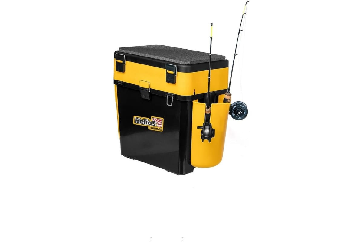 Ящик Helios FishBox Thermo T-FB-T-19-8-BY с термоконтейнером, 19л/8.5л, черный/желтый 321705 подойдет как для зимней, так и для ходовой, береговой и морской рыбалки.Изотермический контейнер из пенополистирола, который расположен внутри ящика, можно использовать для хранения и транспортировки живца или большого объёма живой насадки. Имеется скоба для подвеса аэратора.Изготовлен из морозоустойчивого и ударопрочного пластика, который не подвержен деформациям и прекрасно удерживает первоначальную форму ящика даже при значительном весе рыбака.Протестирован нагрузкой в 210 кг. Корпус не впитывает запахи и легко отмоется от рыбной слизи, глины и других загрязнений.Оптимальная форма и габаритные размеры специально рассчитаны таким образом, чтобы обеспечивать хорошую устойчивость и удобство в переноске.Высота (39,5см) позволяет рыболову использовать ящик в качестве комфортного стула.