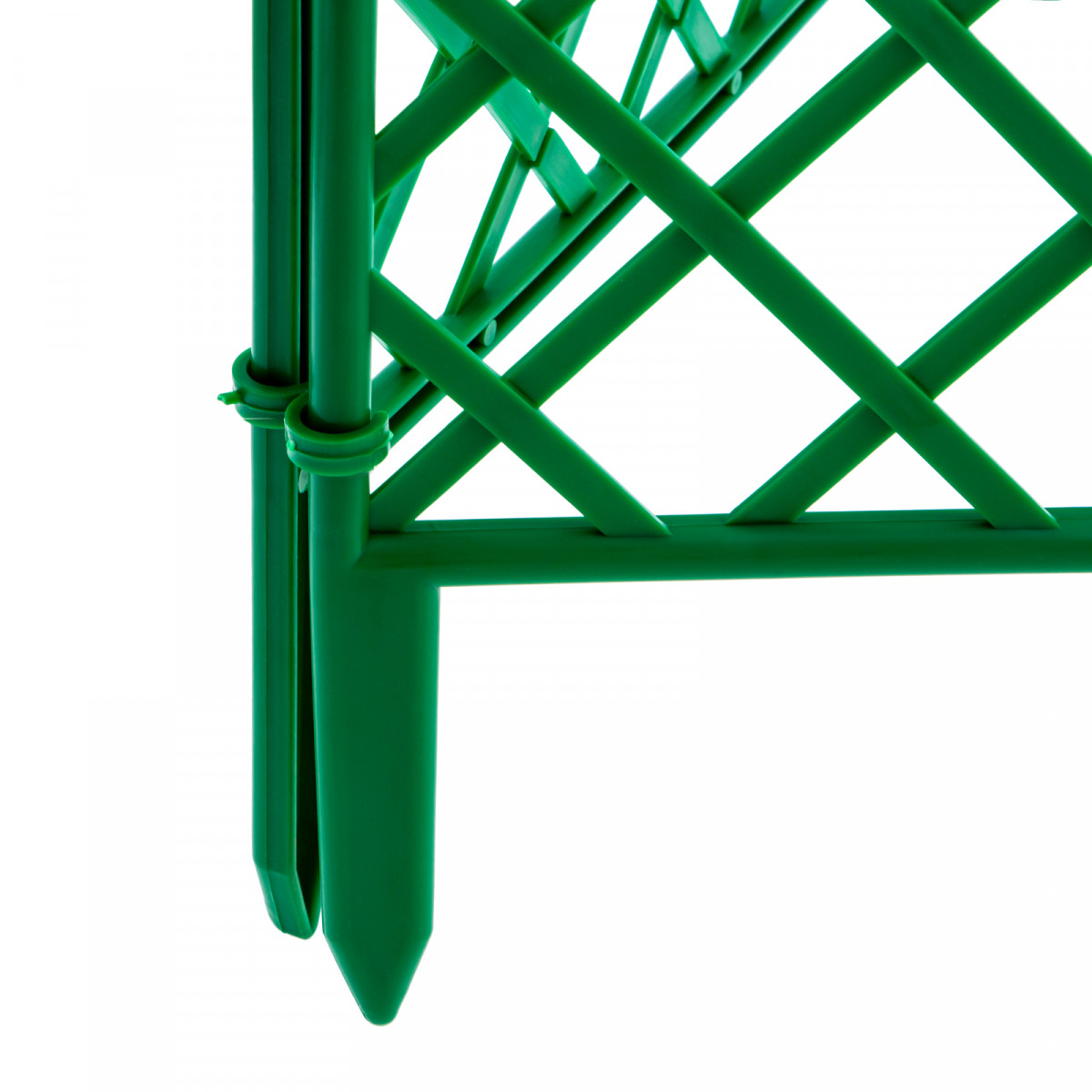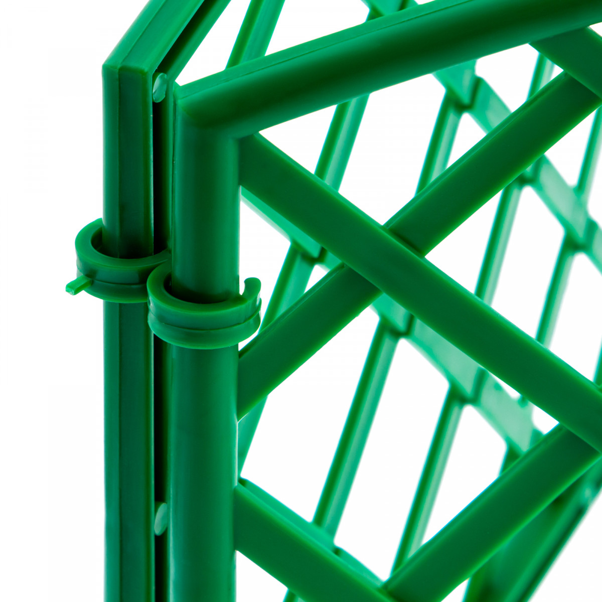 Декоративный забор Palisad «Сетка» 65006 зеленого цвета, размером 24 х 320 см, состоит из 7 секций и позволяет зонировать озелененный участок. С его помощью можно украсить дачную территорию — обозначить границы грядки или зоны отдыха, оформить клумбу, оградить кустарник или дерево.