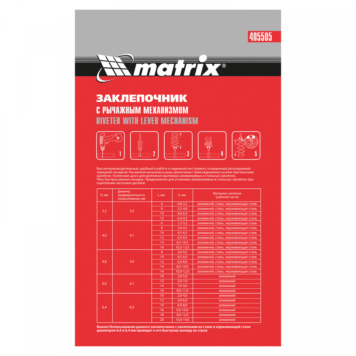 Заклепочник, "Гармошка", усиленный, заклепки 3.2-4.0-4.8-6.0-6,4 мм Matrix