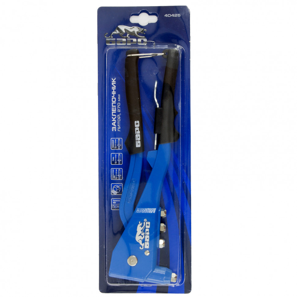 Литой заклёпочник Барс 40425 длиной 270 мм предназначен для работы с вытяжными заклёпками 2,4-4,8 мм. Помогает соединять листовые металлические заготовки, металлопрофиль и легкие конструкции небольшой толщины. Он находит широкое применение как в быту, так и в профессиональной деятельности при проведении строительных, ремонтных и монтажных работ.
