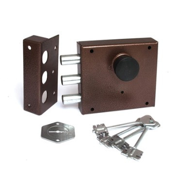 Замок накладной сувальдный с вертушкой. Предназначен для установки на металлические двери. Засов из трех цилиндрических ригелей диаметром 16 мм, с максимальным вылетом 30 мм. Удаление ключевого отверстия - 70 мм. Габариты замка - 120х135х28 мм. Комплектация - 4 ключей, торцевая планка, накладка. Изнутри закрывается с помощью вертушки.