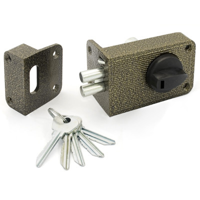 Замок накладной цилиндровый с вертушкой. Предназначен для установки на деревянные двери. Засов из двух цилиндрических ригелей диаметром 11 мм, с максимальным вылетом 25 мм. Удаление ключевого отверстия - 60 мм. Габариты замка - 100х64х22,5 мм. Комплектация - 5 ключей, запорная планка, накладка. Закрывание и открывание замка изнутри производится ручкой, снаружи ключом. Есть функция автоматического запирания.