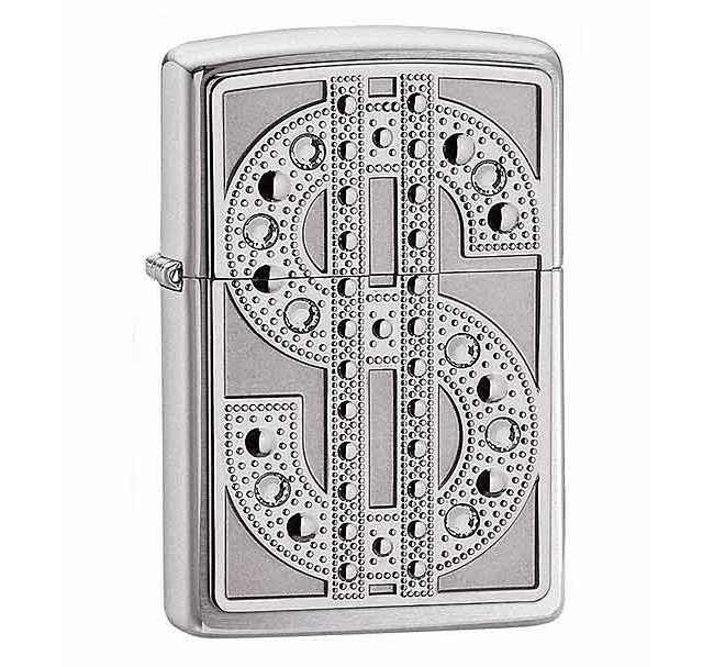 Корпус этой Zippo сделан из матового серого металла, на его поверхности металлическая аппликация в виде символа доллара. Отличный подарок истинному ценителю торговой марки Zippo! Зажигалка Зиппо упакована в фирменную коробку с логотипом Zippo.